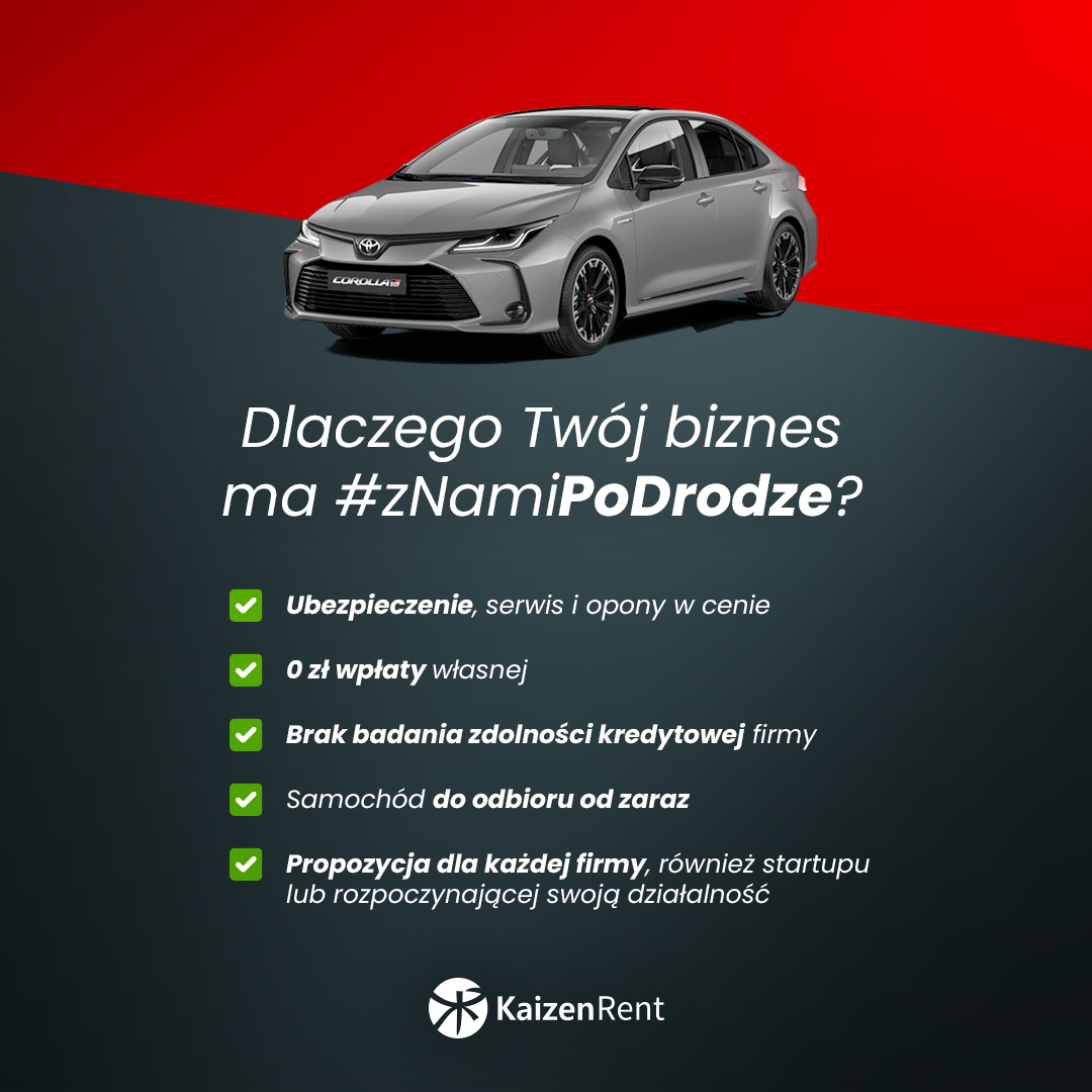 Rozwój firmy, nowe projekty, a może chwilowe potrzeby lub awaryjne sytuacje niecierpiące zwłoki? Nie ważne, jaki jest powód. Elastyczny wynajem samochodów w Kaizen Rent jest usługą szytą na miarę każdego klienta. To korzystne rozwiązanie, stosowane jako uzupełnienie własnej firmowej floty. Dlaczego jest to opłacalne? Najem w Kaizen Rent zapewnia stały i przewidywalny koszt korzystania z samochodów, bez dodatkowych opłat i obciążania zdolności kredytowej firmy. Brak opłaty wstępnej i konieczności wiązania się długoletnim kontraktem pozwala zachować swobodę działania.