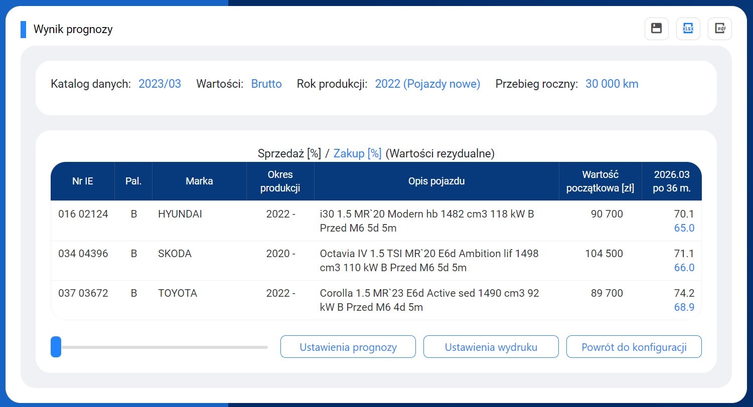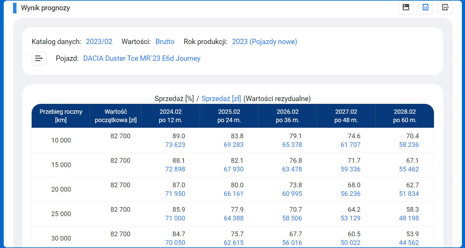 - Prognoza dla wybranego pojazdu przy różnych przebiegach (siatka / matryca)