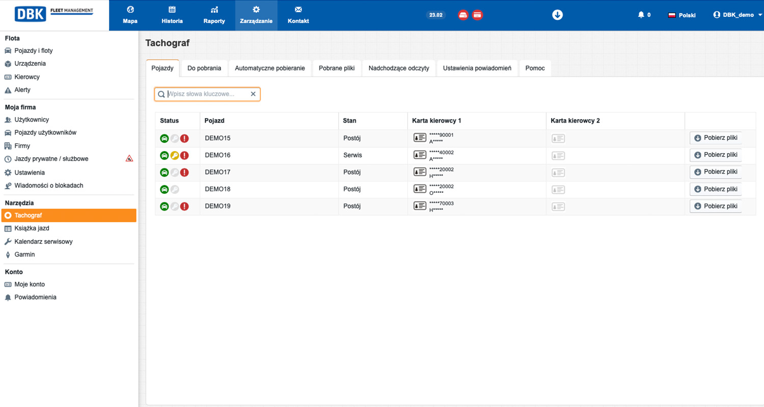 DBK Fleet Management to autorskie rozwiązanie Grupy DBK, największego w Polsce dostawcy produktów i usług dla branży TSL. System wspomoże przedsiębiorcę z każdej branży, stając się niezbędnym narzędziem w codziennej pracy. To oszczędność czasu i pieniędzy, wynikająca z optymalizacji zarządzania zadaniami transportowymi. DBK Fleet Management jest dostępny dla wszystkich marek i typów pojazdów – ciężarowych i dostawczych, naczep i cystern, autobusów, a także samochodów osobowych.